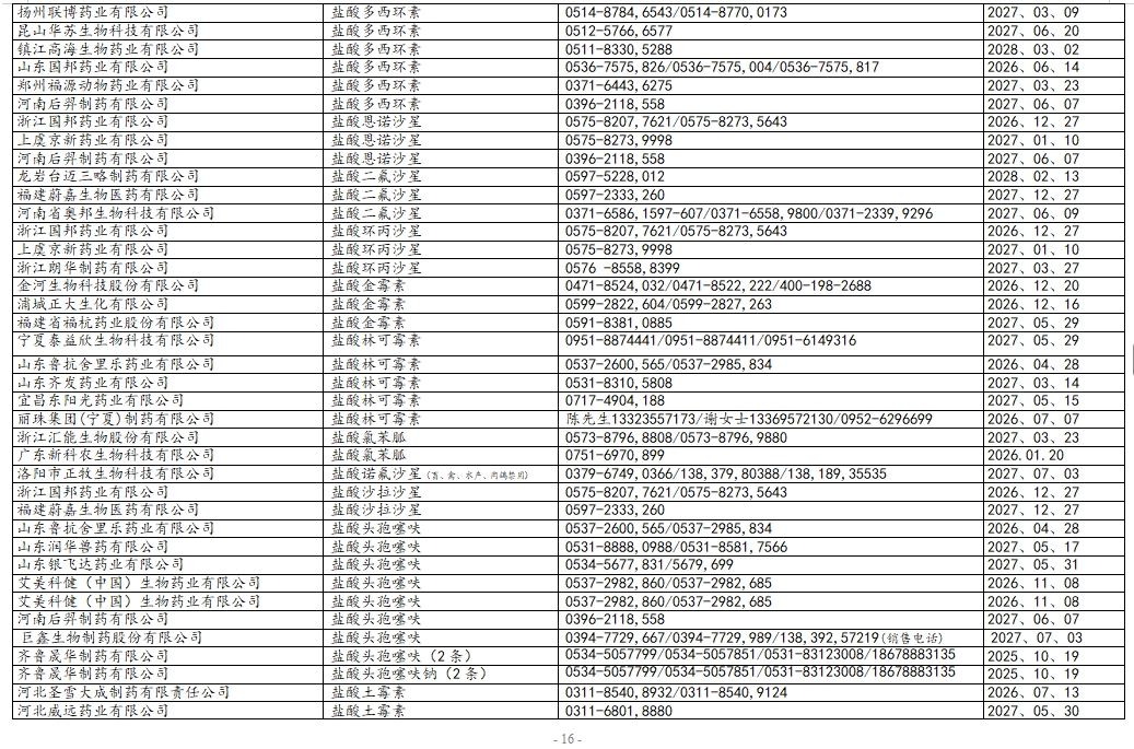 本文档名称为《兽药原料厂及产品目录》,版本为2025.12.30版,共18页。文档以表格形式汇总了兽药原料生产企业的核心信息,每条记录包含原料厂名、原料药名、联系电话及兽药证有效期四个维度,覆盖了多类兽药原料的供应商资源。