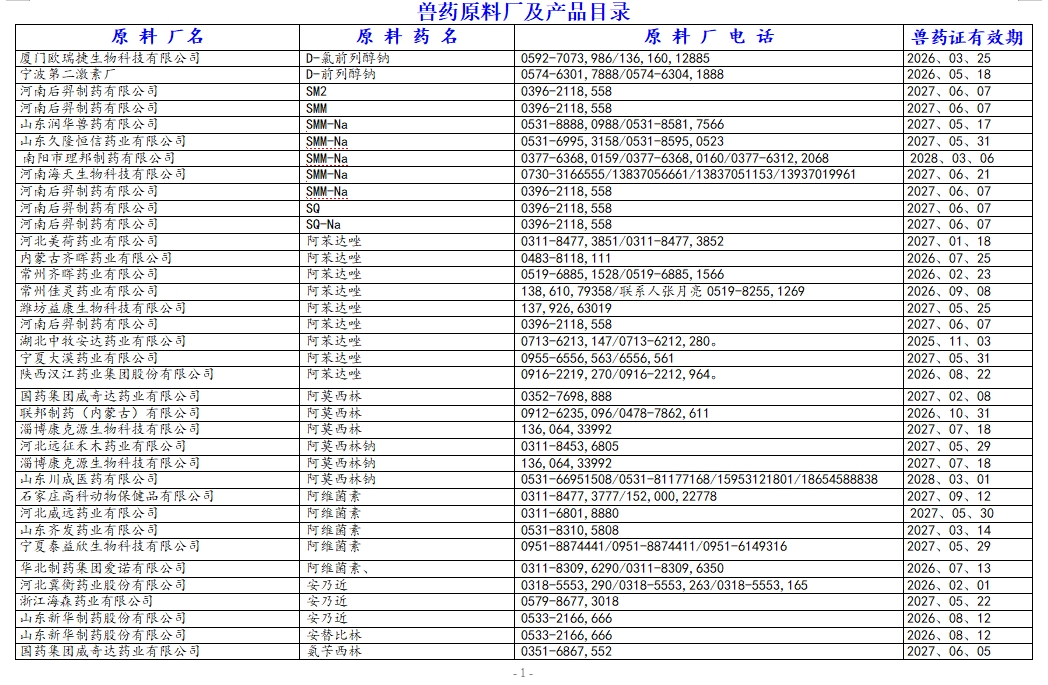 | 主题 : 最新版:兽药原料厂及原料药产品目录(附原料厂电话) |